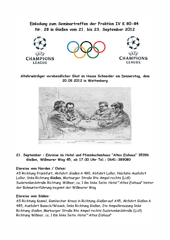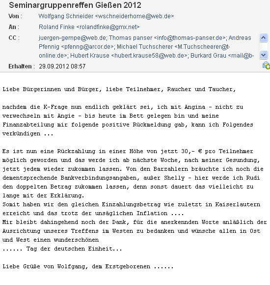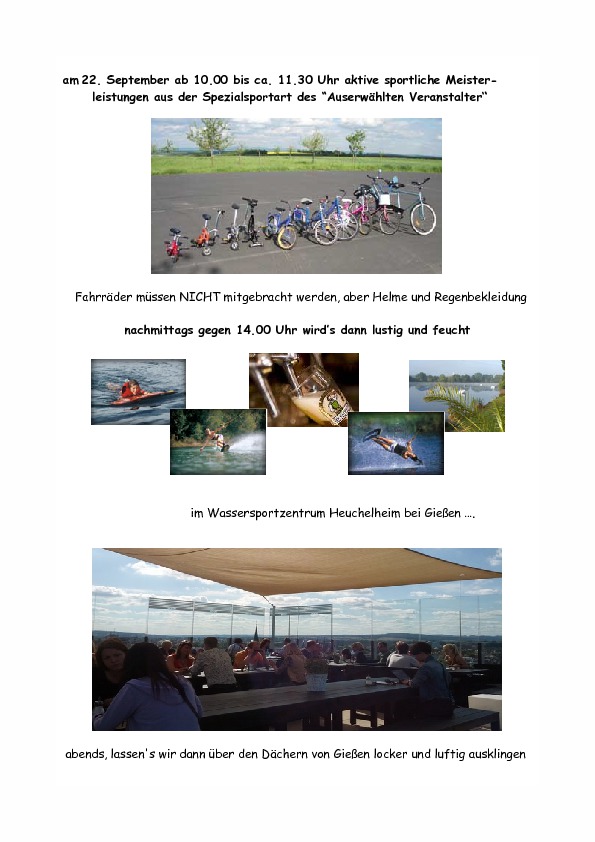 Es findet statt, vom 21.September bis 23. September, hier in Gießen bei Hessen und mitten in Deutschland (Westen). Weil ich ein Super duper tolles Hotel gefunden habe und ich relativ bald verbindlich buchen müßte, benötige ich baldmöglichst Eure Mitteilung ob oder ob auch nicht ihr teilnehmen werdet.