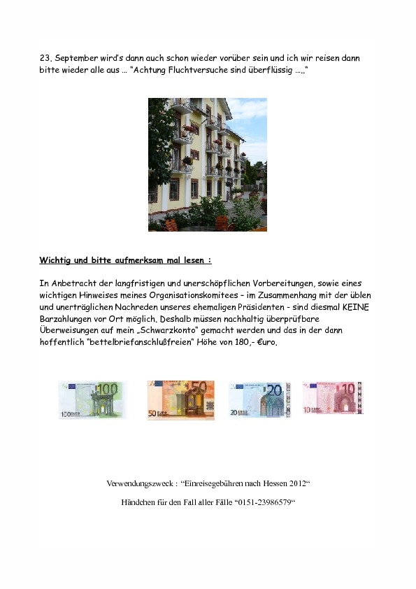 Achtung falls Ihr teilnehmen wölltet, ist in diesem Jahre KEINE Barzahlung möglich, dies orientiert sich anhand des traurigen Abganges letzten Bundespräsidenten - Wulff - aus und mein Pressesprecher empfiehlt dies auch mir und ich will aus der Geschichte auch lernen wollen, aber das nur am Rande von hier aus :-)))